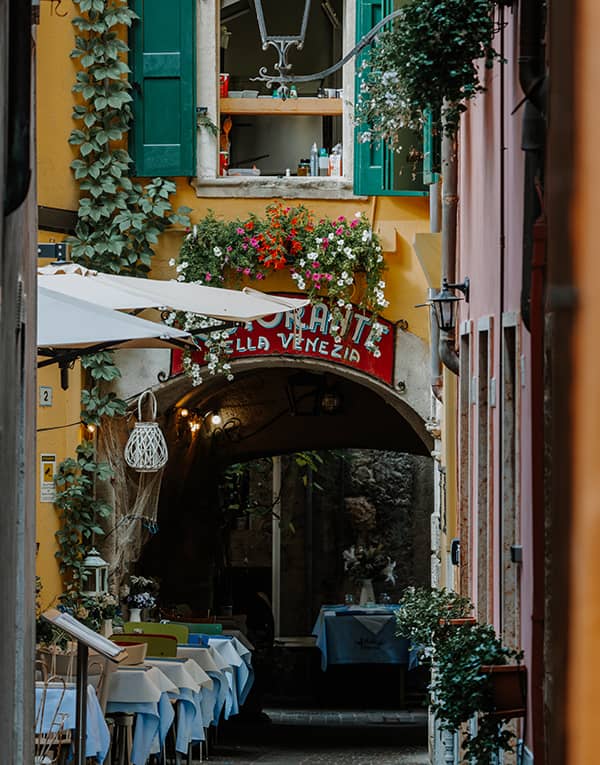 Iniziate con dolcezza, prendetevi il tempo per una colazione con i dolci tipici locali. In una delle pasticcerie del centro o seduti a un tavolino vista lago accompagnate il caffè con la fogassa dolce o con i San Vigilini, i biscotti di frolla e uvetta preferiti da Winston Churchill. Passeggiate tra le calli e le viuzze del centro storico, fra gli scorci nascosti e più pittoreschi, seguendo le tracce del passato, tra i palazzi nobiliari e botteghe storiche. Lo stile dell’architettura richiama Venezia, ma Garda conserva l’atmosfera dell’antico borgo di pescatori. Sulla porta occidentale di San Giovanni è addossato Palazzo Fregoso: si racconta che il poeta rinascimentale Bandello abbia scritto proprio qui una novella su Giulietta e Romeo, ispirando il capolavoro di Shakespeare. Un’altra architettura cinquecentesca è quella elegante di Palazzo Carlotti, che con la Torre dell’orologio è il più suggestivo accesso al cuore storico di Garda. Il palazzo si allunga fino al lungolago e termina con quello che un tempo era la darsena della cittadina, la Losa.